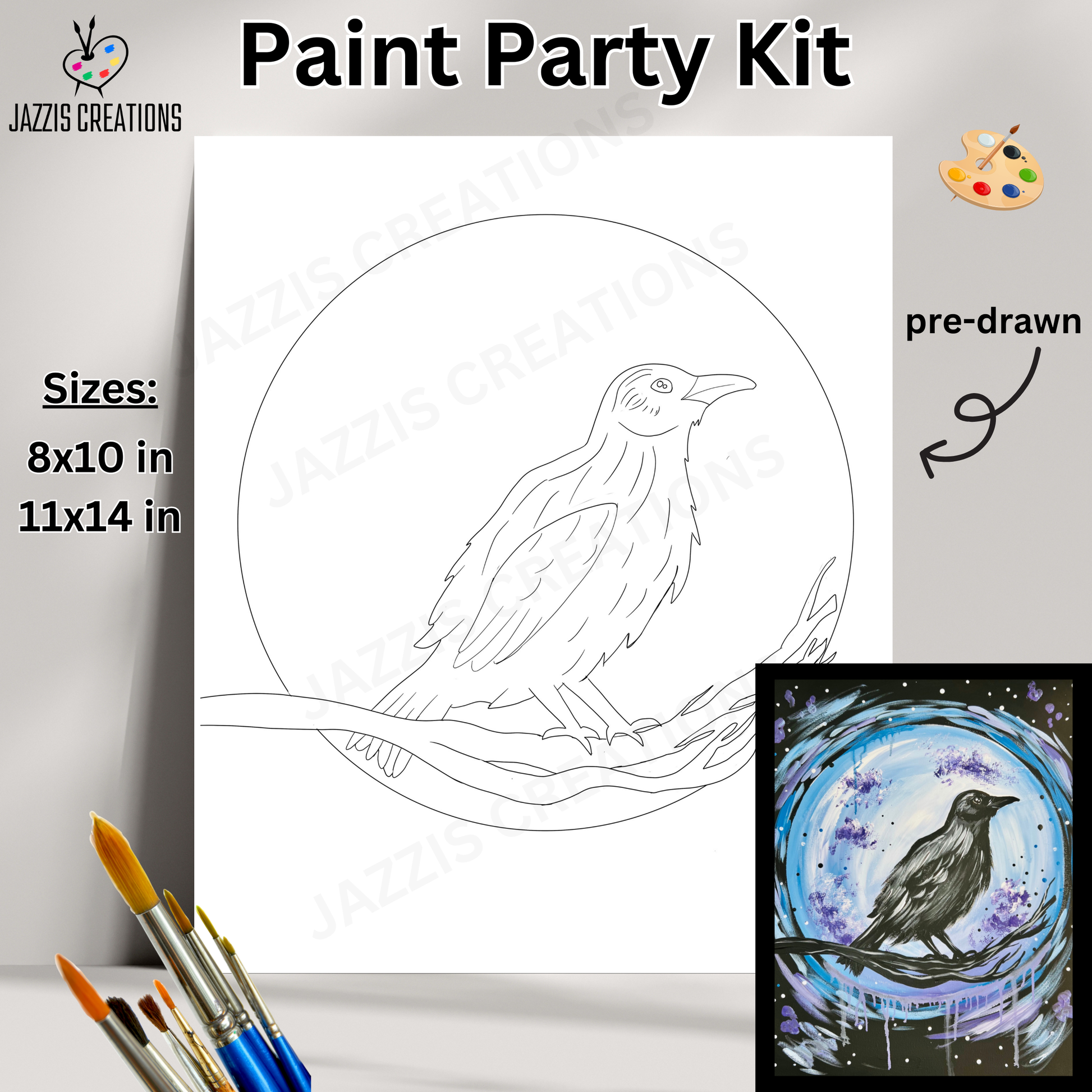 Step into the magic of twilight with this striking raven perched under a glowing moon. This pre-drawn kit makes it easy to capture spooky elegance, whether youโ€™re painting solo or hosting a Halloween paint night.