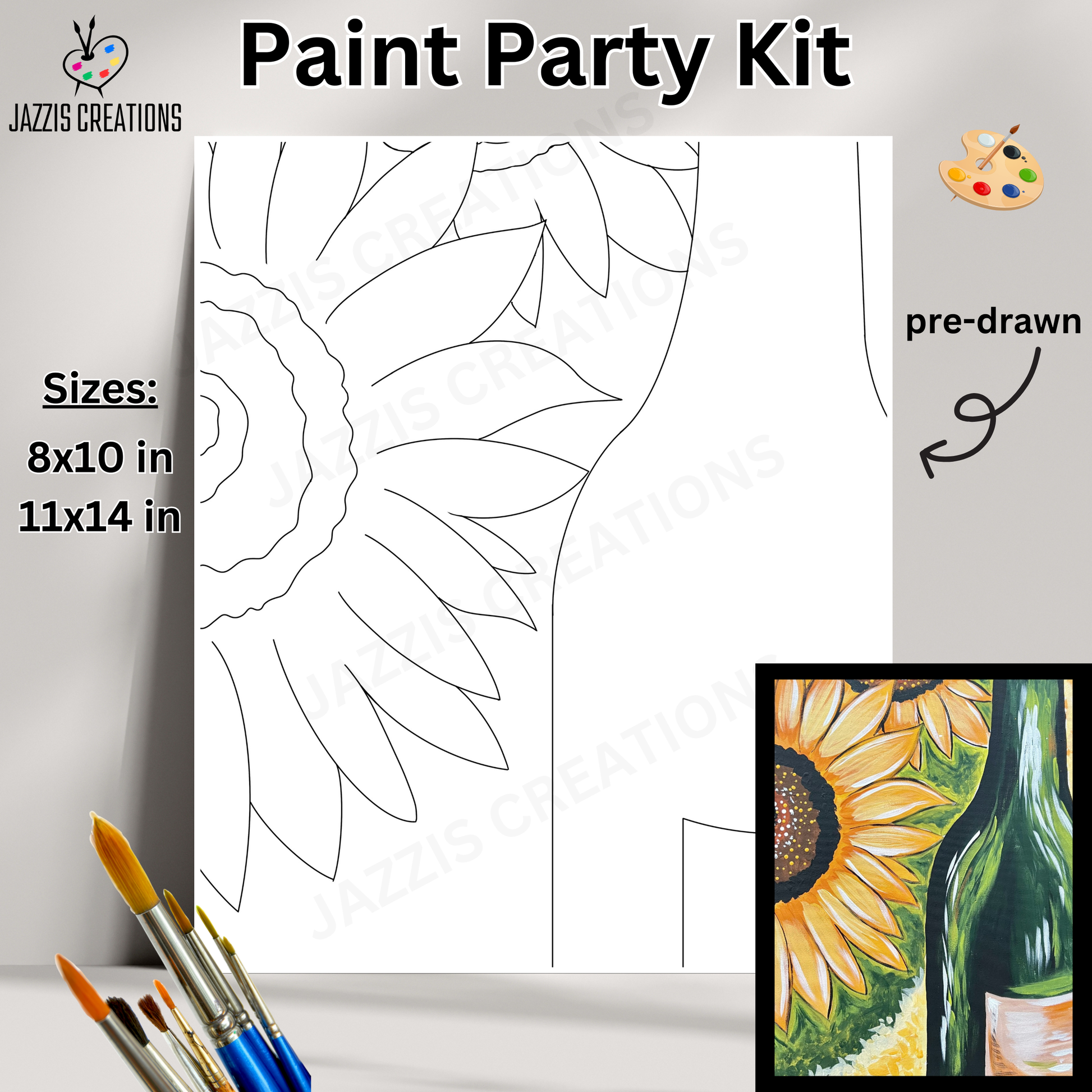 Sip, paint, and unwind with this sunflower + wine bottle scene! Perfect for paint-and-sip nights or relaxing at home, this kit makes creativity easy and fun.