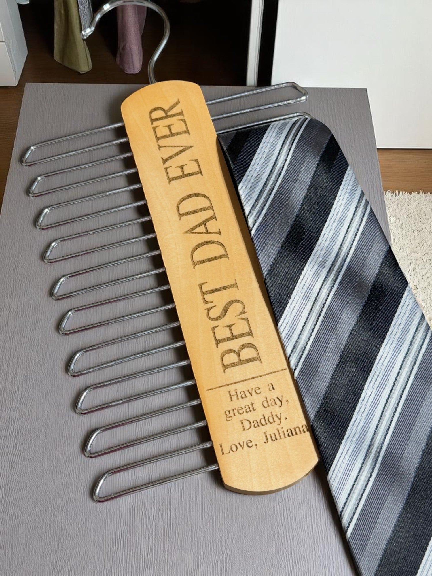 🎁 Personalized Wooden Tie Rack for Dad – "Best Dad Ever" Engraved Gift 🎉
