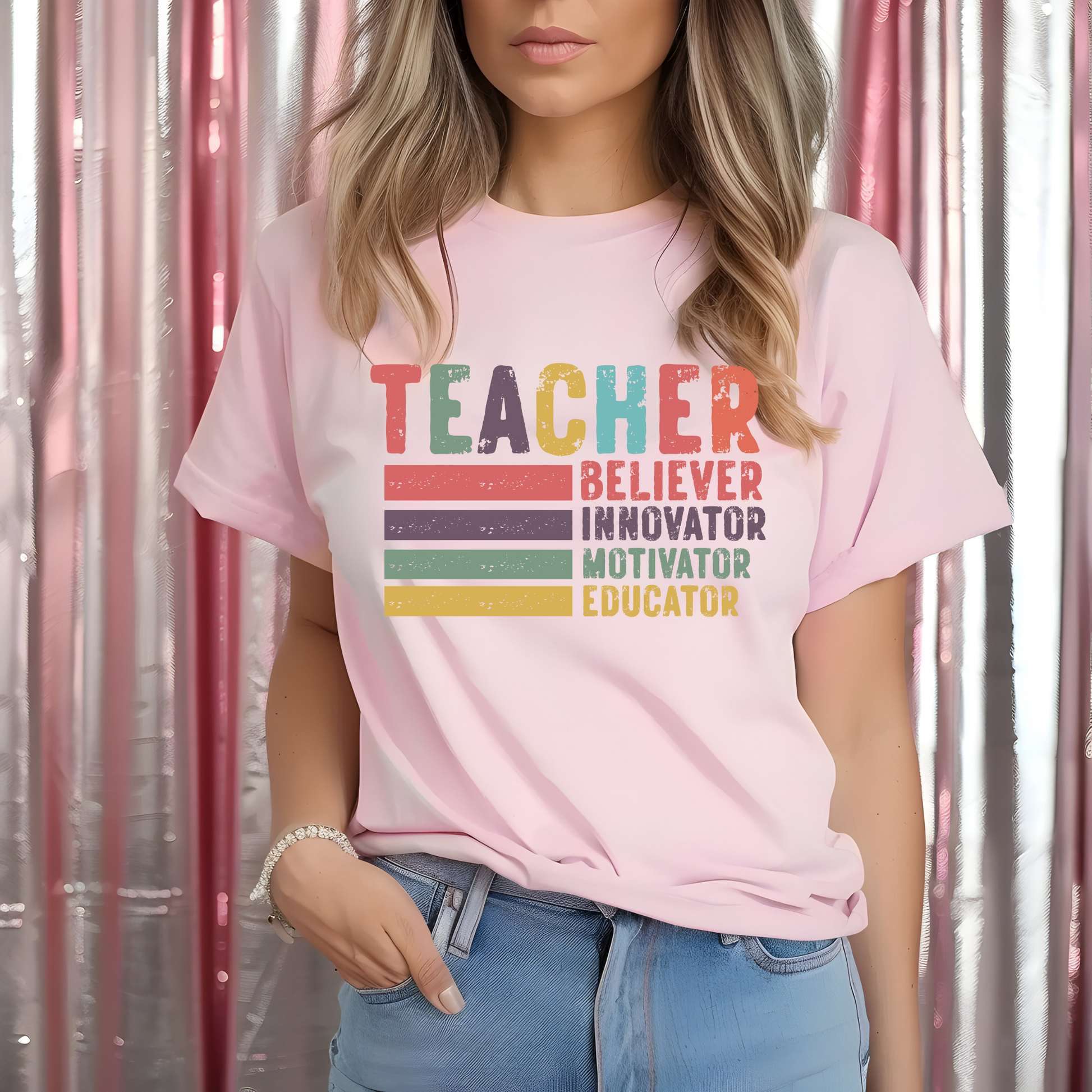 This bold and colorful tee celebrates the many hats a teacher wears β Believer. Innovator. Motivator. Educator. A comfy and inspiring addition to your wardrobe or a meaningful gift for your favorite teacher. ππ