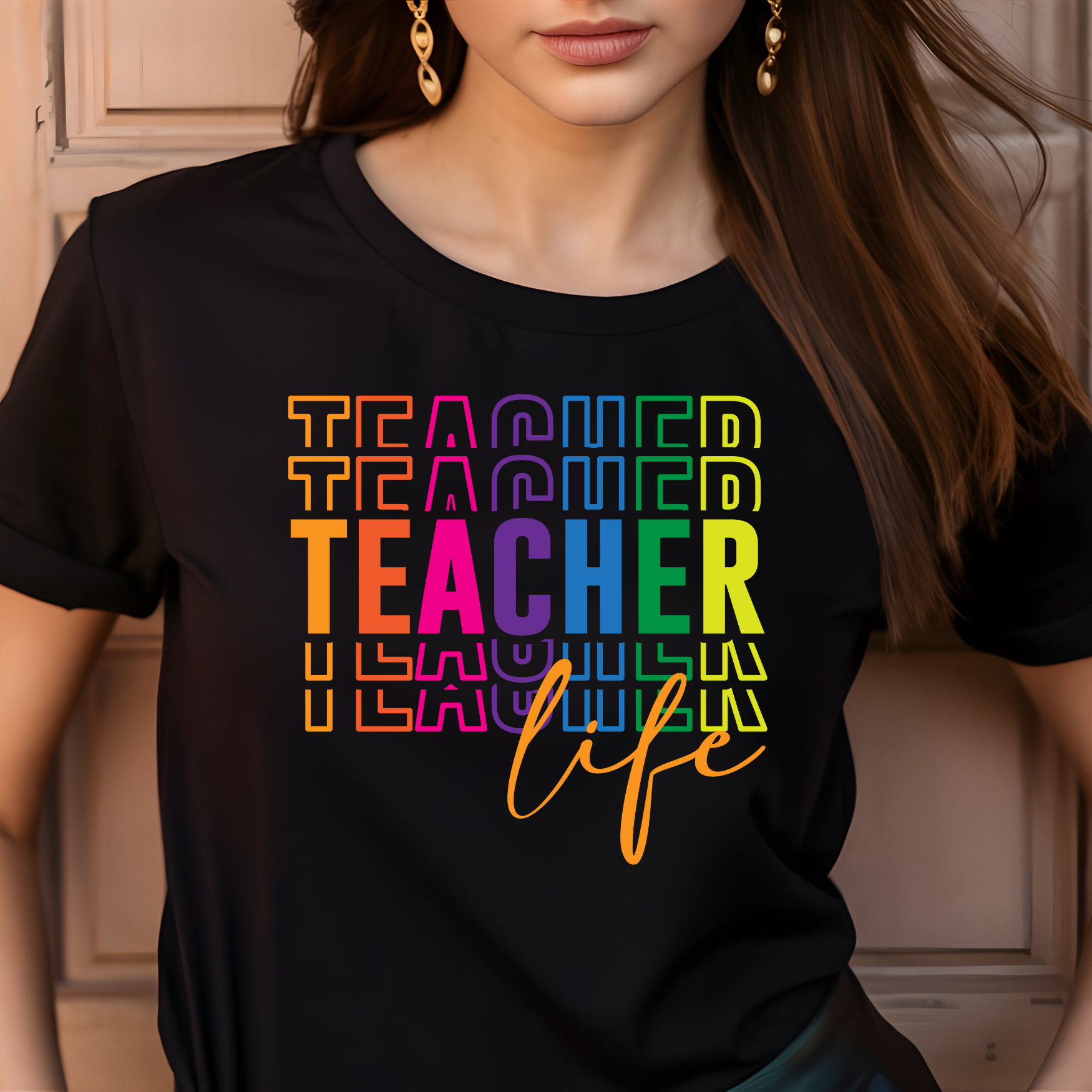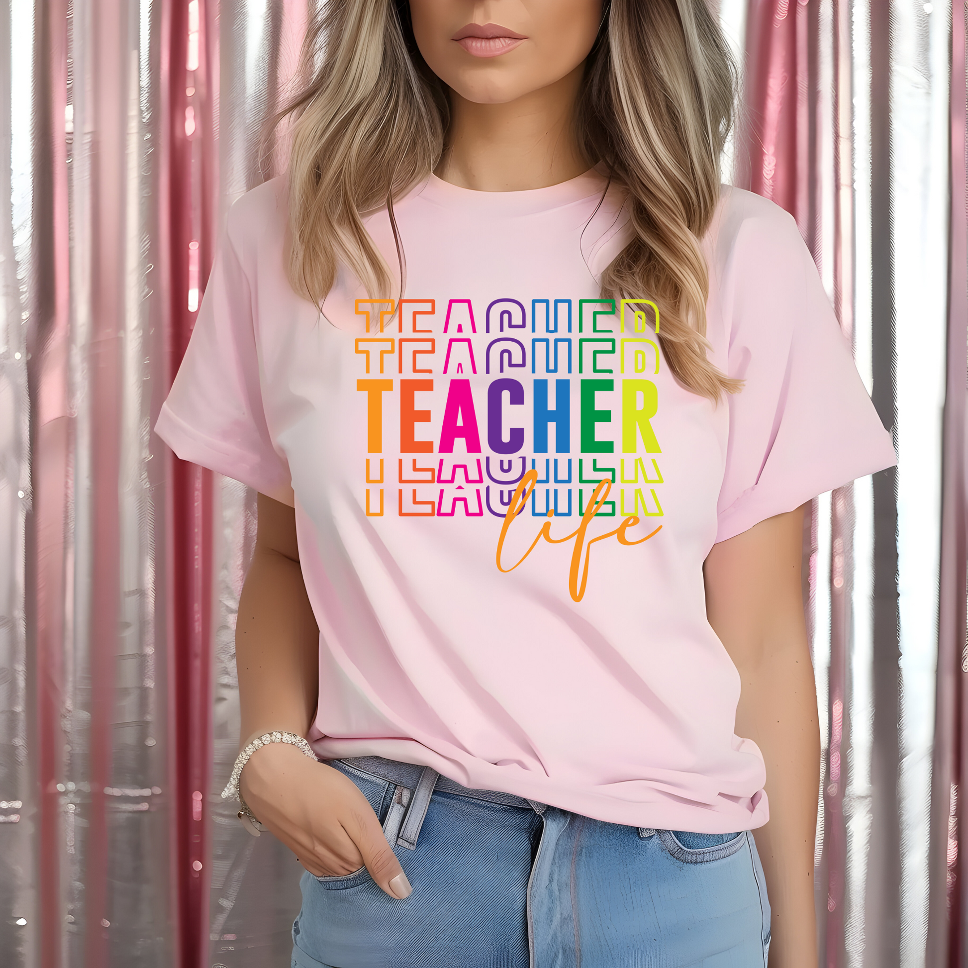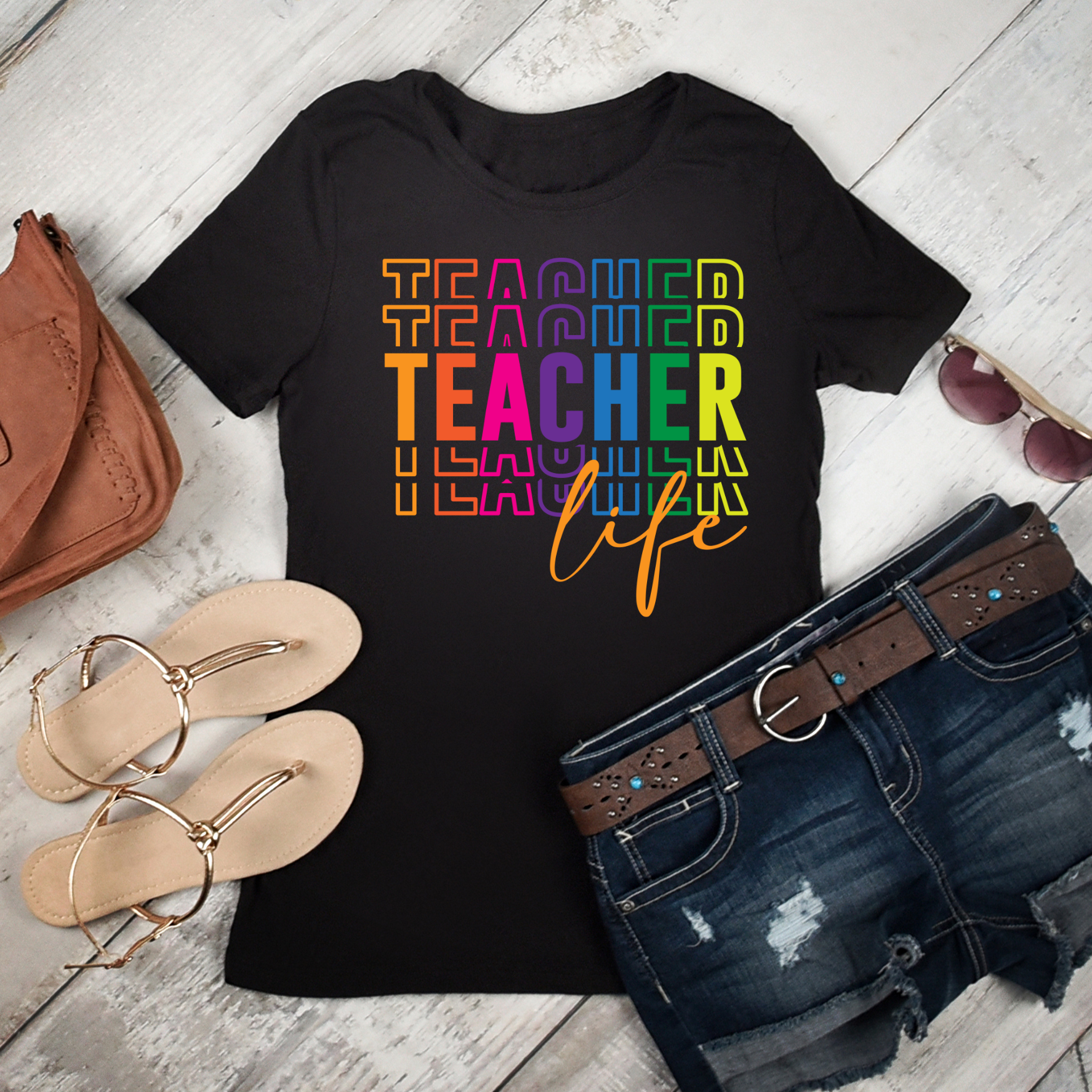 Say it loud and proud β Teacher Life never looked so colorful! With a stacked rainbow block font, this tee is made to pop whether you're in the classroom or out and about. ππ